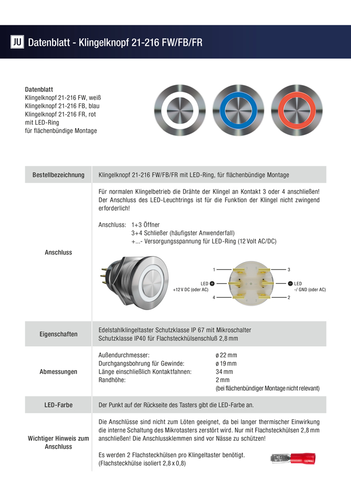 Technical information Locks Mailbox locks are available in standard version with two-point locks and as reinforced locks. Special punchings for the integration of locking system cylinders from third-party manufacturers are possible after specifying the product used. Name plates Name plates are available in a standard version (plastic plate) in anti-vandal design as well as theft-proof scew-on plates with or without a name engraving. Doorbell button/light button Doorbell buttons are available in round design as pushbuttons, as a combi button (name plate with integrated doorbell button), as well as as a button made of stainless steel, illuminated or non-illuminated. Intercom grid Intercom grids are available in standard version made of aluminum profile as well as for steel and stainless steel parts in laser-finished design (customer-specific patterns can be taken into account). Engravings Aluminum components can be engraved or completely engraved. Engraving in stainless steel is possible in engraved and deposited versions, whereby perforations can be backlit. In addition, all Windows compatible fonts (Truetype) are possible in font heights or based on the space available. Special engravings (symbols, coat of arms etc.) can be made upon prior consultation. For more information on engraving, see page 172. Dimensions The dimensions are indicated in the following order: width – height – depth in mm. They are valid for each individual compartment with the DIN tolerances. Our delivery conditions Our general conditions of sale apply to all deliveries and offers. All deviating arrangements require our confirmation in writing. In addition, the statutory provisions apply. Up to a net value of EUR 500.- delivery is not free of charge. Starting from EUR 500.- delivery is free. Up to a net value of EUR 150.- we charge a packaging cost of EUR 2.50. Up to EUR 250.- 3.0 % of the net value Up to EUR 500.- 2.5 % of the net value Up to EUR 1000.- 1.5 % of the net value Starting from EUR 1000,- 1.0 % of the net value Postal shipping EUR 7.20 Package shipping/forwarding EUR 21.00 Freight forwarding EUR 40.00 Delivery time Indication of the delivery week means the date of dispatch from the factory or delivery warehouse. CE symbol The conformity of our products with DIN EN 13724 as defined in the applicable guidelines corresponds to the current needs of the market. All products which meet these essential requirements are marked with the CE symbol (see fig.) and can be freely marketed in the European internal market. Retention of title The supplied goods shall remain our property until complete fulfillment of all claims and demands arising from the business relationship towards the customer, including possible interest on arrears and other costs. The supplied goods may not be sold, pledged or surrendered as long as they remain our property. Should it be seized by a third party, we should be notified without delay. The claimant should be notified that the goods are our property. Amendmets We reserve the right to make changes to the dimensions and finishes as a result of further development of our products, as well as amend prices. Upon publication of a new price list, all previous price lists shall be deemed invalid. Definitions of DIN EN 13 724 DIN EN 13724 replaces the previously valid DIN 32617 and specifies the requirements and test methods for mail slots which are valid in accordance with the manufacturer installation instructions. DIN EN 13724 considers protection and break-in safety as well as user-friendliness and security for the user and ergonomy and efficiency for the deliverer. The mailboxes marked with DIN EN 13724 or DIN in the JU catalogue comply without exception with there quirements laid down in the standard. DIN EN 13724, among other things, contains the following provisions (excerpt): Type 1 1. Use in outdoor areas 2. Indoor use 3. Mail slots in through-wall mailboxes 4. Mail slot in doors or door side wall Larger formats 1. Portrait format – Mail slot opening 30 - 40 x 325 - 440 mm 2. Landscape format – Mail slot opening 30 - 40 x 230 - 280 mm Corrosion and water intrusion Grade 0 No specified resistance Grade 3 Good resistance Grade 4 Very good resistance Security (burglary prevention) Grade 1 Standard resistance (e.g. 200 different lockings) Grade 2 Increased resistance (e.g. 500 different lockings) Installation height of mail slot opening For ergonomic reasons, the slot should range between 700 and 1,700 mm (for intercom systems, we recommend 1,200 to 1,450 mm height). Furthermore, DIN EN 13724 contains guidelines and notes on the effort required to open and close the flap, fire protection regulations, confidentiality, removal safety, distance measurements, mail stacking height. The fulfillment of the DIN EN 13724 requirements must be proven by the correspondingly defined test requirements. DIN standard All our products marked with the DIN symbol comply with DIN EN 13724. General information Mailboxes, tray folds and letter distribution systems are to be arranged in such a way that they are at any time easily accessible and handy, whereby private banks of mailboxes and individual inhouse mailboxes should be attached in such a way that they can be operated without entering the buildings. Note: According to Landgericht Berlin, judgment as of 11.05.1990, AZ 29 S 20/90, non-compliance with the DIN standards resulted in rent reductions. Powder-coatings The powder-coating for JU products has a layer density of 100 µm and is baked at approx. 200 ° C. The colouring is possible with all colours of the RAL colour chart, whereby assemblies can be designed in different colour shades. Assemblies made of aluminum can be provided with anodised coloured tones according to the colour table of the main catalogue. JU colour palette The colour reproduction according to the JU colour palette on page 180 is only approximation. The RAL colour, the anodised colour and the RAL colour chart are binding for
