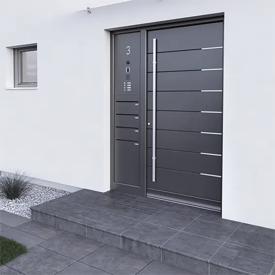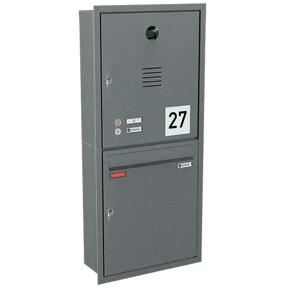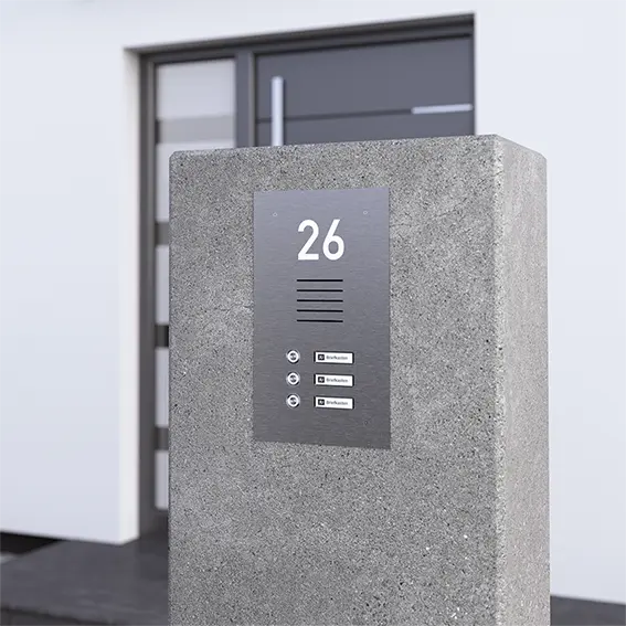 First Class Die JU First Class besticht durch höchste Qualität, Funktionalität und ansprechendem Design. Hier werden hochwertige Komponenten verbaut. Sie haben die Wahl zwischen exklusiven Verkleidungen und Putzrahmen für Ihren Briefkasten. Hier ist die Schalenverkleidung Nova 40 mm verbaut. Briefkasten Die Anzahl und Anordnung der Briefkasten sowie des Sprech-Klingelfachs kann individuell auf Ihre Wünsche angepasst werden. Dieses Modell ist mit 6 senkrechten Briefkasten sowie einem Sprech-Klingelfach ausgestattet. Frontplatten Neben den 6 Briefkasten mit Avantgarde-Einwurfklappen befindet sich das Sprech-Klingelfach. Es gibt die Möglichkeit gedämpfte Briefkastenklappen mit unserem JU SCS® Soft-Close-System zu verwenden, um lästige Klappergeräusche beim Schließen der Klappe zu vermieden. Ausstattung Das Sprech-/Klingelfach ist mit Kameramodul sowie einem gelaserten Sprechsieb ausgestattet. Die beleuchteten Namensschilder und Klingelknöpfe werden bei unseren First Class Modellen immer flächenbündig verbaut. Die Komponenten sind diebstahlsicher eingebaut und können nur mit Schlüssel und Spezialwerkzeug bedient werden. First Class Unsere JU First Class verbindet Qualität, Funktionalität und Design. Mit flächenbündig eingebauten und beleuchteten Komponenten sowie einer geräuschlos schließenden Einwurfklappe mit SCS® Soft-Close-System werden diese Anlagen abgerundet. Sie haben die Wahl zwischen exklusiven Verkleidungen und Putzrahmen. Die Anzahl und Anordnung der Briefkasten kann individuell auf Ihre Ansprüche angepasst werden, von Briefkasten für Einfamilienhäuser bis hin zu Wohnkomplexen ist für alle Bedürfnisse das richtige dabei. Schalenverkleidung Nova 40 mm 22-320 Einwurfklappe JU SCS® Soft-Close-System Sprechsieb 21-174 Zylinderschloss 21-140 Klingelknopf Edelstahl flächenbündig, ringbeleuchtet weiß 21-216FW Namensschild diebstahlgesichert, flächenbündig, aus Plexiglas 21-134 Klingelknopf Edelstahl flächenbündig, ringbeleuchtet rot 21-216FR Einlegeschild „Lichtsymbol“ 21-147RP Einlegeschild „Keine Werbung“ 21-146 Produktbeispiele - First Class Durchwurfbriefkasten für Mauerwerk Durchwurfbriefkasten für Mauerwerk Türseitenteilanlagen Türseitenteilanlagen Vollisolierte Türseitenteilanlagen Durchwurfbriefkasten für das Türseitenteil Durchwurfbriefkasten für das Türseitenteil Durchwurfbriefkasten für das Türseitenteil Zaunbriefkastenanlagen Zaunbriefkastenanlagen Zaunbriefkastenanlagen Senkrechte Briefkasten Senkrechte Briefkasten Senkrechte Briefkasten Senkrechte Briefkasten Senkrechte Briefkasten Senkrechte Briefkasten Senkrechte Briefkasten Senkrechte Briefkasten Avantgarde Avantgarde Avantgarde Avantgarde Avantgarde Avantgarde Avantgarde Avantgarde Stelen Stelen Stelen Stelen Stelen Stelen Stelen Stelen Stelen Waagrechte Briefkasten (raumsparend) Waagrechte Briefkasten (raumsparend) Waagrechte Briefkasten (raumsparend) Waagrechte Briefkasten (raumsparend) Waagrechte Briefkasten (raumsparend) Waagrechte Briefkasten (raumsparend) Safety Class Sprech- und Klingelanlagen Sprech- und Klingelanlagen Paketfachanlagen Paketfachanlagen Paketfachanlagen Paketfachanlagen Paketfachanlagen Paketfachanlagen Paketfachanlagen